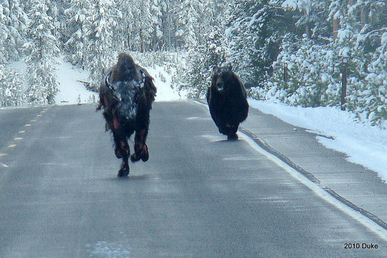 Seen here is a grizzly bear chasing an injured bison. The bison had suffered burns from a hot spot in the park.