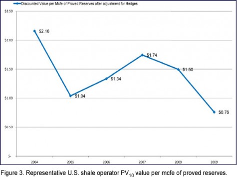 Our evaluation suggests that there is limited commercial value from these plays despite public enthusiasm and operator claims. E&P company shareholders have subsidized low natural gas prices and have little hope of recovering their investment in the near term. The underlying problem is a failure to grasp the concept of discounting. Reserves that are produced in small volumes over decades have little future value and are, therefore, not reserves. The shale plays are called resource plays for a reason: they are all about resources but not profit or the shareholder.