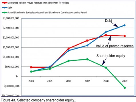 The stated value of these PUDs actually decreased over the same multi-year period (Figure 3) because of increased cost and debt. When the overall financial picture is considered, the pursuit of low-value shale gas assets has destroyed shareholder value (Figures 4a and 4b).