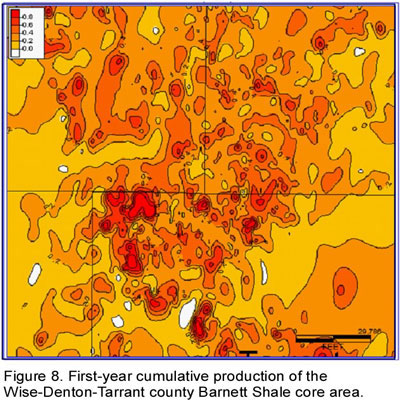 This figure is a map of first-year cumulative production so it involves no interpretation of decline rates or ultimate recovery. Red or hotter colors describe areas of better production and brown to yellow, or cooler, colors show areas of poorer production. The map shows extreme heterogeneity within the core area where high Barnett production volumes are unevenly distributed and many non-commercial wells have been drilled adjacent to excellent wells. The claim of repeatable and uniform results by the shale play promoters cannot be supported by case histories to date. We contend that the factory model is not appropriate because the geology of these plays is more complex than operators claim.