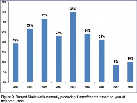 The high shale gas reserve forecasts by operating companies are based on long individual well lives of as much as 65 years. In the Barnett Shale, wells were grouped by the year of completion and evaluated based on current monthly gas production. The percentage of wells from each group that are currently producing less than 1 million cubic feet of gas per month is shown in Figure 9. This gas volume only covers the cost of well compression assuming $5/Mcf without royalty payments or other costs. In other words, 25-35% of wells drilled over the past six or seven years are not paying for the cost of compression so what is the justification for 40-65 years of advertised commercial production?