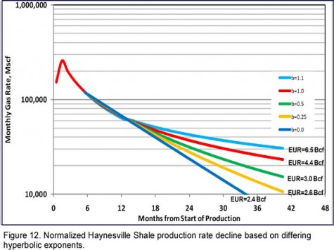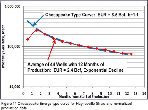 Consider also the Chesapeake type curve for the Haynesville Shale (Figure 11) which predicts that an average well will produce 6.5 Bcf of gas reserves.