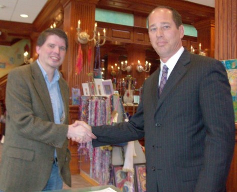 Pictured here is John Snyder (LEFT), husband of Olga, with whom he owns & operates the Olga Gallery, Cafe, & Bistro and Senator Joe Scarnati (RIGHT).