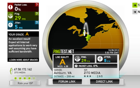 Yesterday I received a few complaints about the site loading slowly. I initially thought it was due to a high volume of traffic combined with several search engine crawlers hogging up our bandwidth, but after investigating the matter I determined that there was a substantially high packet loss when pinging our server from any location outside our network. This was mostly likely due to a problem with our ISP, ZitoMedia. I’m happy to report however, that continual testing since last night has shown the network to be stable and performing exceptionally well. We are looking at increasing bandwidth, but such services are simply not reasonably available in Coudersport at this time. Above is a visual test performed minutes ago. As you can see, the ZitoMedia network is performing exceptionally well. If anyone continues to have trouble loading the site, please let me know asap so that we can look into the matter. Our goal is to keep CoudyNews.com loading as fast as possible (still need to do some script cleaning and frankly the Facebook plugin is horrible).